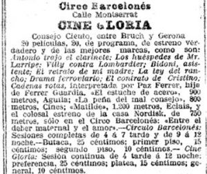 En 1914 cristaliza un nombre que define mejor el concepto: Recreo Cine Gloria. La palabra “recreo” no es decorativa; es declaración de intenciones. Este no era solo un cine, era un lugar de ocio que en verano volvía al jardín y en invierno intentaba mantenerse activo. Ese año se documenta la programación conjunta con el Circo/Teatro Barcelonés, un tipo de alianza que era frecuente para compartir copias, atraer público y presentar “programas” más potentes.