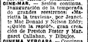 Tras el final de la guerra, el local reapareció el martes 2 de mayo de 1939 con el nombre CINEMAR, sin grandes proclamaciones, sin el entusiasmo publicitario que solía acompañar a las reaperturas. Y la programación parecía decir: “volvemos a lo básico”. Proyectó “De bote en bote” (Laurel y Hardy), “Pasaporte a la fama” (Edward G. Robinson), además de cómica y dibujos. Un cine que regresa por lo más seguro: comedia, ritmo, nombres conocidos.