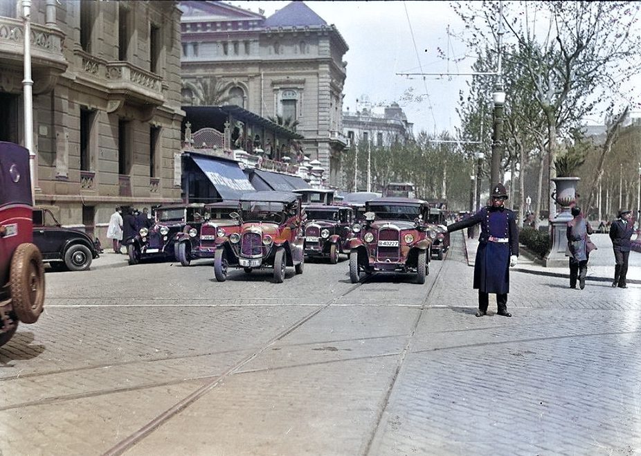Los primeros semáforos de Barcelona eran gobernados a mano por la Guardia urbana… Al principio podían lucir rojo i ámbar simultáneamente para permitir giro a la izquierdista. Y verde y ámbar para permitir giro a la derecha.
