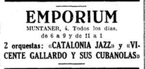 Durante la Guerra Civil, el rastro publicitario del Emporium se vuelve débil, como si el local hubiera quedado prácticamente parado o con actividad intermitente. La reapertura llega el 13 de mayo de 1939, ya en plena posguerra, con un anuncio más contundente: dos orquestas en cartel, Catalonia Jazz y Vicente Gallardo y sus Cubanolas, señal de que el Emporium quería volver a ser “sitio” y no solo sala de baile.